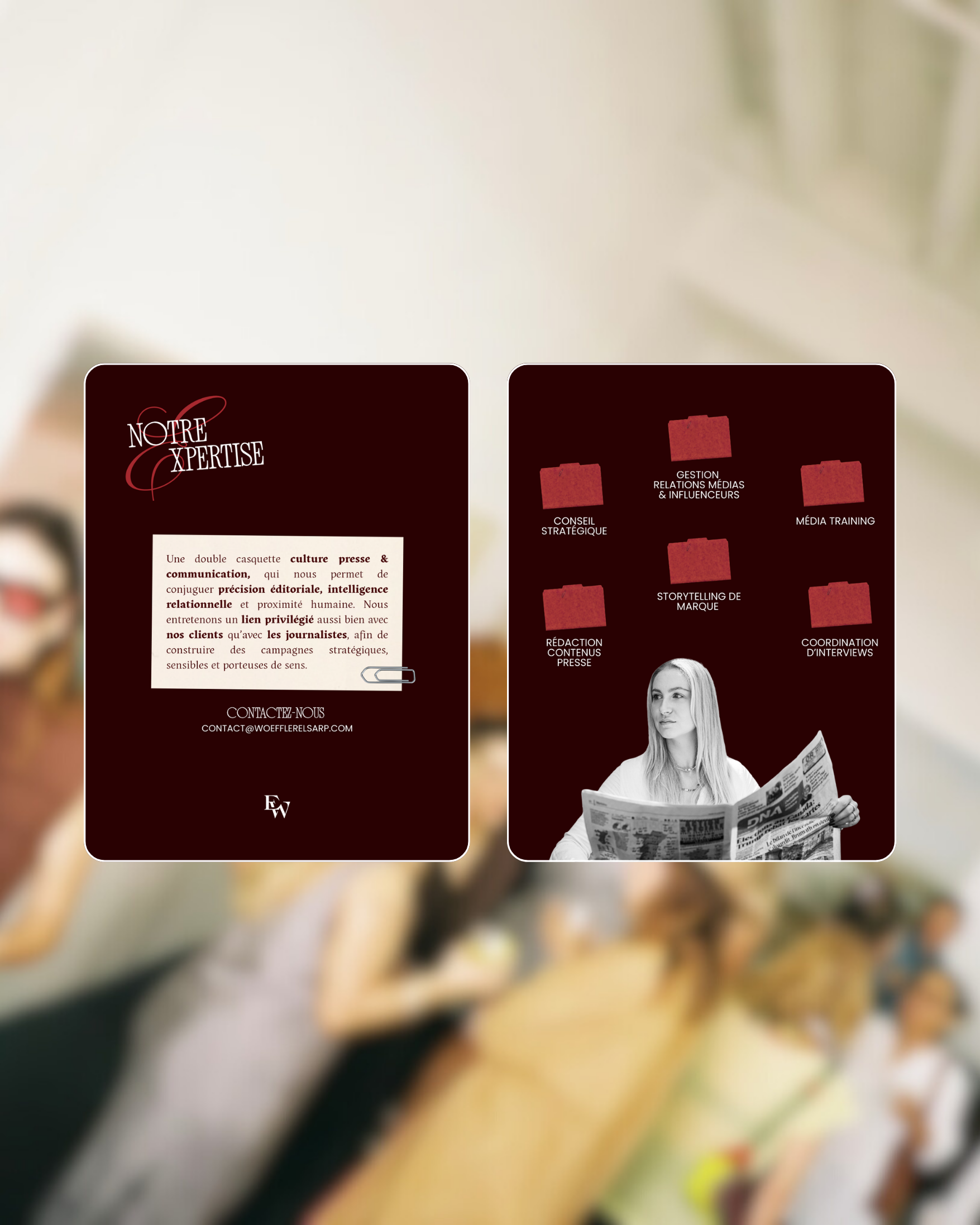 Sur les réseaux sociaux, nous avons créé des stratégies de contenu multi-plateformes adaptées à chaque audience. Sur Instagram, nous créons du contenu pour mettre en avant l’agence de RP via des résultats clients, vie d’agence et tips pour éduquer une cible qui ne connaît pas l’avantage des relations presse. Sur LinkedIn, nous construisons une présence plus professionnelle axée sur la stratégie, le branding et un positionnement d’expert. L’objectif : combiner authenticité, storytelling et performance pour développer la visibilité et la crédibilité d’Elsa Woeffler RP.