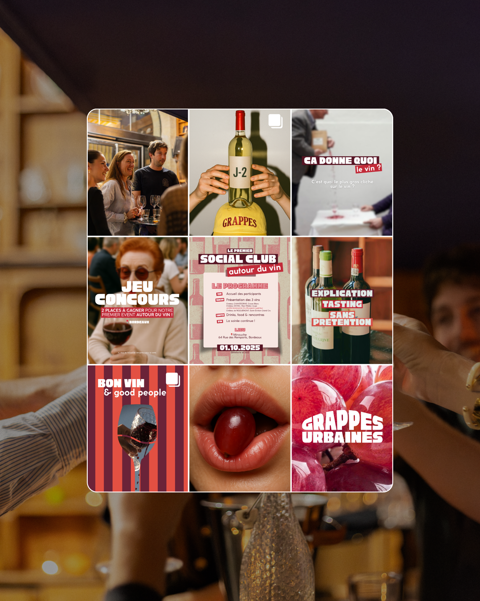 Pour Grappes Urbaines, nous avons imaginé une stratégie de contenu complète mêlant informations, notoriété et performance. D’un côté, des contenus informatifs (flyers digitaux, annonces d’événements, actualités) pour animer la communauté et relayer les temps forts du social club. De l’autre, des contenus de notoriété comme des vidéos de présentation du concept ou des micro-trottoirs pour incarner la marque et casser les codes du vin traditionnel.