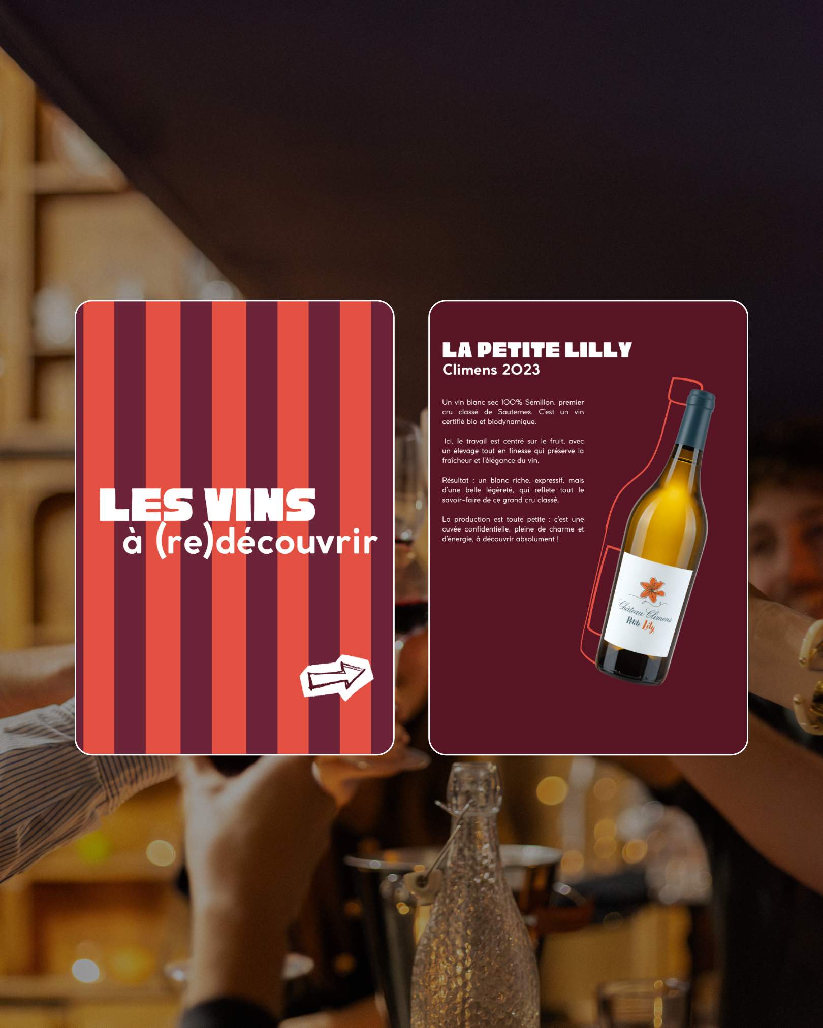 L’ambition : rendre le vin plus accessible, esthétique et vivant, tout en créant du lien entre amateurs, curieux et créateurs. C’est une nouvelle manière de vivre le vin, entre culture, partage et modernité.